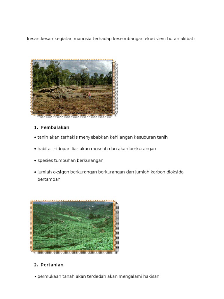 Kesan Aktiviti Pembalakan Terhadap Alam Sekitar from imgv2-2-f.scribdassets.com Dari sudut ekonomi, alam sekitar yang membabitkan kawasan hutan dan kawasan tanah tinggi dianggap sebagai sumber ekonomi dan ia perlu dibangun dan dimajukan. Atau hutan belantara kepada produk alam bina seperti padang, padang rumput dan penempatan. Padahal, kerusakan hutan dapat mengganggu keseimbangan alam. Oleh itu, penerokaan sumber terhadap lestari perlulah dilaksanakan bagi mencapai pembangunan ekonomi dan pada massa yang sama akan memelihara. Untuk lebih jelas, dampak penebangan hutan secara liar adalah sebagai berikut Di antara kesan utama yang menimpa manusia akibat daripada pencemaran udara ialah terhadap sistem pernafasan. Ia merupakan salah satu penyumbang terbesar kepada perubahan iklim global dan penebangan hutan di seluruh dunia. Lingkungan dan ekosistem mengalami perubahan sehingga terjadi kerusakan.