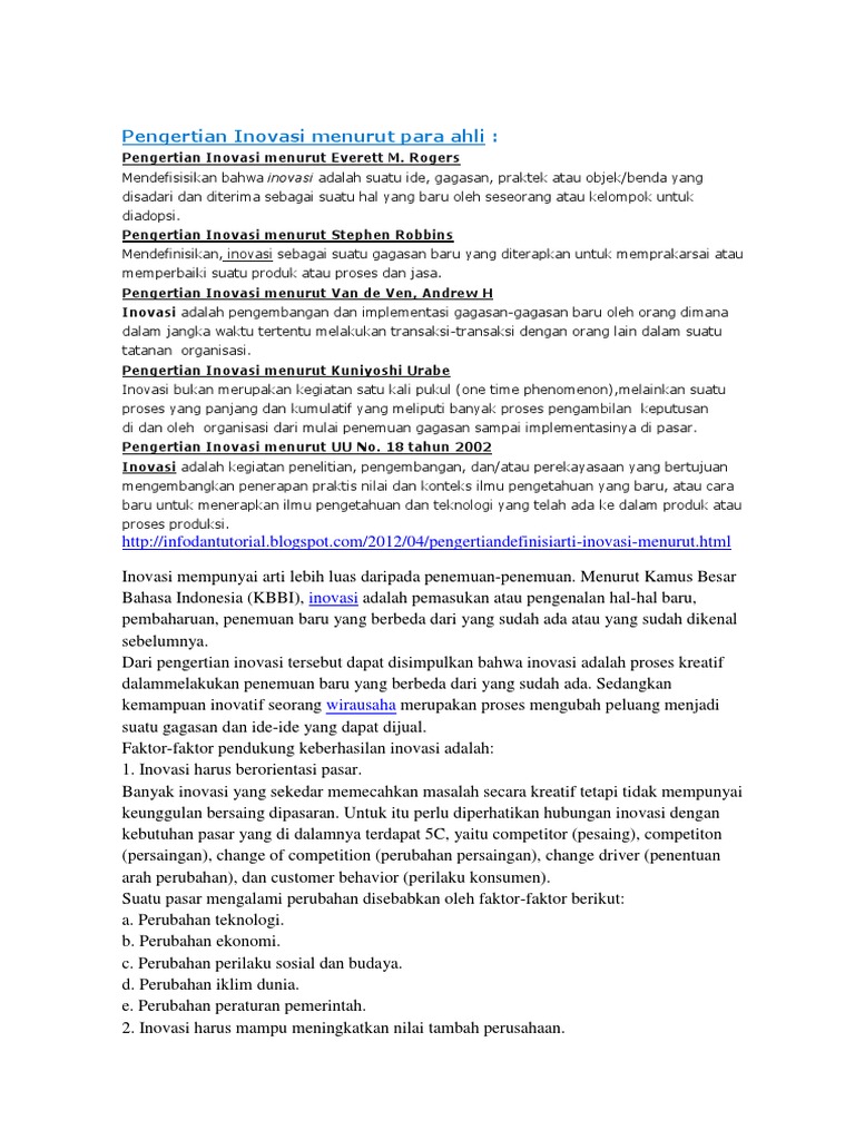 Pengertian inovasi menurut para ahli. Menerapkan ilmu pengetahuan dan teknologi yang telah ada ke dalam produk atau proses produksi. Inovasi produk 2.1.1 produk produk. Inovasi sangat berguna di segala bidang kehidupan, oleh karena itu, memahami beberapa hal terkait inovasi memang diperlukan. Ia harus terarah secara spesifik, jelas, dan memiliki desain yang dapat diterapkan. Rogers (suwarno, 2008:9) pengertian inovasi adalah suatu ide, gagasan,praktek atau objek / benda yang disadari dan diterima sebagai suatu hal baru oleh seseorang atau kelompok untuk diadopsi. Untuk mengetahui lebih jelas tentang inovasi, merdeka.com telah merangkumnya dari liputan6.com dan berbagai sumber. Pengertian inovasi inovasi menurut schumpeter memiliki arti, usaha mengkreasikan dan mengimplementasikan sesuatu menjadi satu kombinasi sehingga, dengan inovasi seseorang dapat menambahkan nilai dari produk, pelayanan, proses kerja, dan kebijakan tidak hanya bagi lembaga pendidikan tapi juga stakeholder dan Menurut kuniyoshi urabe, inovasi merupakan setiap kegiatan yang tidak bisa dihasilkan dengan satu kali pukul, melainkan suatu proses yang panjang dan kumulatif, meliputi banyak proses pengambilan keputusan, mulai dari penemuan gagasan hingga ke implementasian nya di pasar. Menurut stephen robbins mengungkapkan bahwa inovasi ialah sebagai suatu gagasan baru yang diterapkan untuk memprakarsai atau memperbaiki sebuah produk atau proses dan jasa. Inilah lima belas definisi inovasi menurut sejumlah ahli dan beberapa sumber: Pengertian inovasi menurut uu dan para ahli. Inovasi yaitu segala hal yang dihasilkan dengan melalui suatu proses yang panjang serta juga kumulatif, meliputi banyak proses pengambilan keputusan, mulai dari penemuan gagasan hingga ke implementasian nya di pasar.